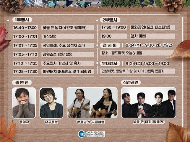 행사는 팝페라 4인조 '꽃을 든 남자'의 식전 공연으로 시작되며 이어 캠프마켓 공원 조성 방향에 대한 설명을 통해 시민들과 캠프마켓의 변화와 미래 계획을 공유한다.