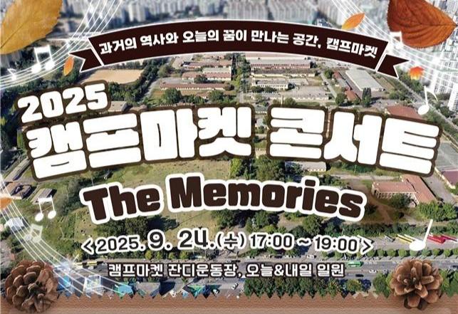 인천광역시(시장 유정복)는 오는 9월 24일 오후 5시, 부평 캠프마켓 개방 공간인 잔디운동장에서 '2025 캠프마켓 콘서트 The Memories'를 개최한다고 밝혔다.
