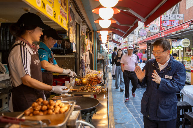 화양시장에서 상인과 소통하는 김경호 광진구청장.이번 행사는 서울시 공모사업으로 마련됐으며, 중곡제일시장, 화양제일골목시장, 면곡시장 골목형 상점가, 건리단길 골목형 상점가 등 4곳이 선정돼 시비 15백여만 원을 확보했다.
