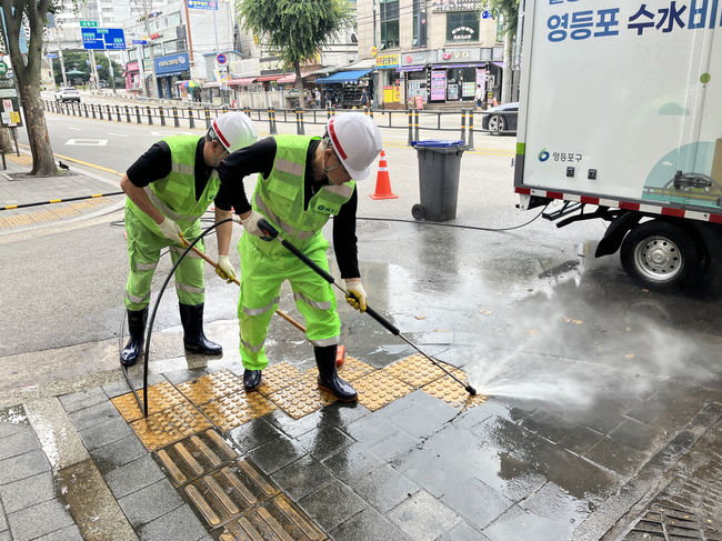 ‘영등포 청결 수(水)비대’ 활동 모습.서울 영등포구(구청장 최호권)는 도심 곳곳의 찌든 때와 악취를 제거하고 도시 미관을 개선하기 위해 ‘출동! 영등포 청결 수비대’를 신설하고 본격 운영에 들어갔다고 22일 밝혔다.
