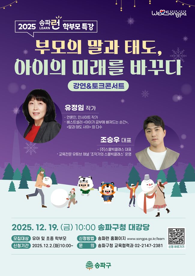 구는 12월 2일 온라인 참가 접수와 함께 사전 설문조사를 실시해 토크콘서트에서 다룰 질문을 미리 선별할 예정이다. 유아, 초등 및 중학생 자녀를 둔 학부모를 대상으로 무료 진행되며, 참여 신청은 내달 2일 오전 10시 송파런 누리집에서 사전 접수하면 된다.