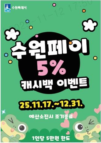 수원특례시는 17일부터 12월 31일까지 '수원페이 5% 캐시백 이벤트'를 연다. 수원페이 충전금으로 결제하면 5% 캐시백을 지급한다.