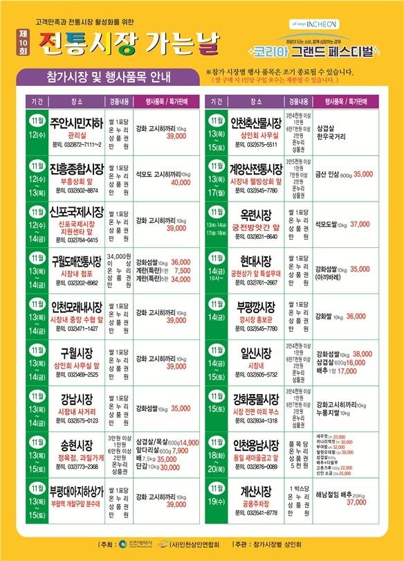 행사에 참여하는 시장은 주안시민지하상가, 진흥종합시장, 신포국제시장, 구월도매전통시장, 인천모래내시장, 구월시장, 강남시장, 송현시장, 부평대아지하상가, 인천축산물시장, 계양산전통시장, 옥련시장, 현대시장, 부평깡시장, 일신시장, 강화풍물시장, 인천용남시장, 계산시장으로 총 18개 전통시장에서 진행된다.