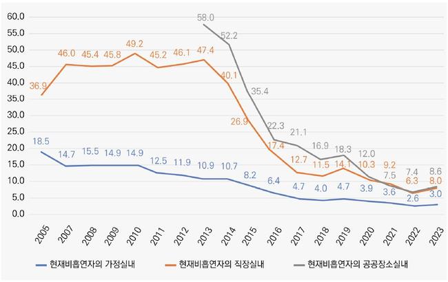 간접흡연 노출률 추이 - 출처: 2025년 담배폐해 기획보고서-간접흡연 (자료원: 2023 국민건강통계, 질병관리청)