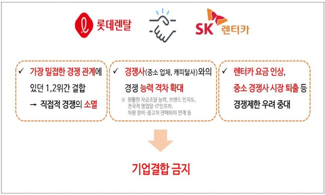 공정거래위원회는 26일 사모펀드 어피니티가 롯데렌탈 주식 63.5%를 취득하는 기업결합을 심사한 결과, SK렌터카와 롯데렌탈 간 경쟁이 소멸돼 렌터카 요금 인상 등 경쟁제한 우려가 크다며 해당 결합을 금지했다.