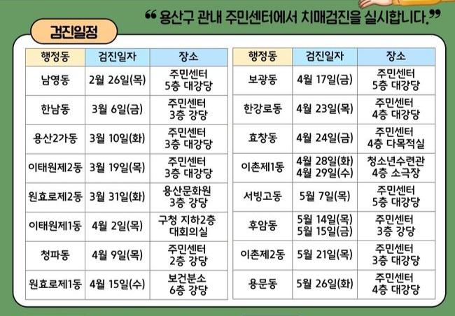 검사 대상은 치매 진단을 받지 않은 용산구 주민이며, 1인당 연 1회 무료로 참여할 수 있다.