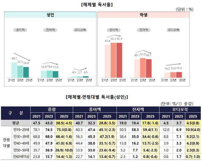 2025년 국민 독서실태 조사에서 학생 독서율은 94.6%를 기록한 반면 성인 독서율은 38.5%로 감소하며 세대 간 독서 격차가 뚜렷하게 나타났다.
