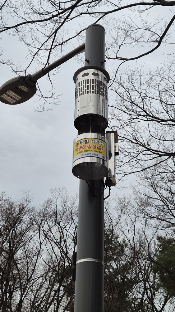 고척근린공원에 설치된 포충기 모습.구로구(구청장 장인홍)는 2026년 주민참여예산을 활용해 이번 사업을 추진했다고 2일 밝혔다. 설치된 포충기는 자외선(UV LED)으로 모기와 날벌레를 유인·포획하는 방식으로, 화학 약품을 쓰지 않아 친환경 해충 관리가 가능하다. 1대당 유효 면적은 500㎡다.