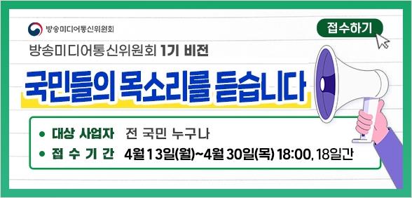 새롭게 출범한 방송미디어통신위원회가 향후 정책 방향 설정을 위해 전 국민 의견 수렴에 나섰다. 방송미디어통신위원회는 ‘1기 비전 국민 의견 청취’를 이 날부터 30일까지 진행한다고 밝혔다.