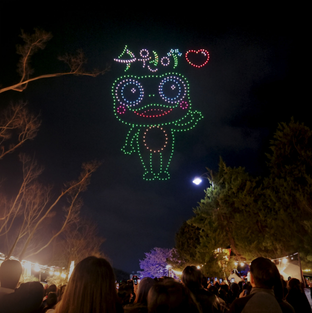 드론쇼에는 수원시를 대표하는 공식 캐릭터 ‘수원이’가 등장해 눈길을 끌었다. 수원이는 수원의 청개구리를 모티프로 탄생한 캐릭터로, 드론 500대가 만석거 상공에서 수원이의 형상을 구현하며 지역 정체성과 공연 콘텐츠를 하나로 연결했다. 수원 시민들에게 친숙한 캐릭터가 밤하늘에 펼쳐지는 장면은 관람객의 큰 호응을 이끌어냈다.