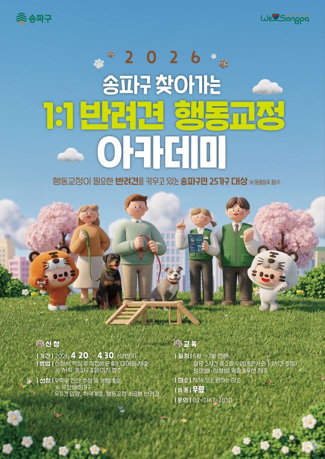 송파구 관계자는 "반려견 문제행동은 전문가의 손길이 닿으면 강아지도, 보호자도, 이웃도 모두 편안해진다"며 "성숙한 반려 문화를 만드는 데 송파구가 든든한 동반자가 되겠다"고 말했다.