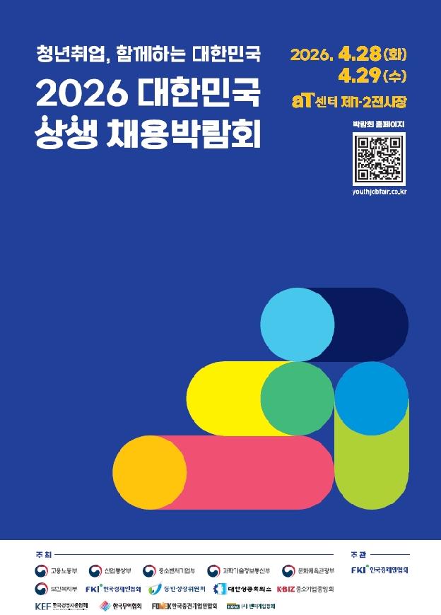 고용노동부와 관계부처, 경제단체는 28일부터 이틀간 서울 양재 aT센터에서 약 700개 기업이 참여해 2200명 이상 채용을 목표로 하는 ‘2026 대한민국 상생 채용박람회’를 열고 청년 구직자 대상 다양한 취업 지원 프로그램을 운영한다고 밝혔다.